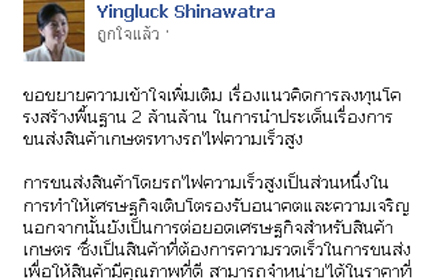ราวเที่ยงของวันนี้ (29 มี.ค.2556) แฟนเพจ Yingluck Shinawatra ซึ่งเป็นช่องทางประชาสัมพันธ์ความเคลื่อนไหวของ น.ส.ยิ่งลักษณ์ ชินวัตร นายกรัฐมนตรี ได้โพสต์ข้อความชี้แจงกรณีที่มีเสียงฮือฮาถึงคำพูดของ น.ส.ยิ่งลักษณ์ ในการชี้แจงเรื่อง พ.ร.บ.กู้เงิน 2 ล้านล้านบาท เมื่อวันที่ 28 มี.ค.2556 ว่า “มีรถไฟความเร็วสูง ขนผัก ผักจะได้ไม่เน่า” โดยมีข้อความว่า