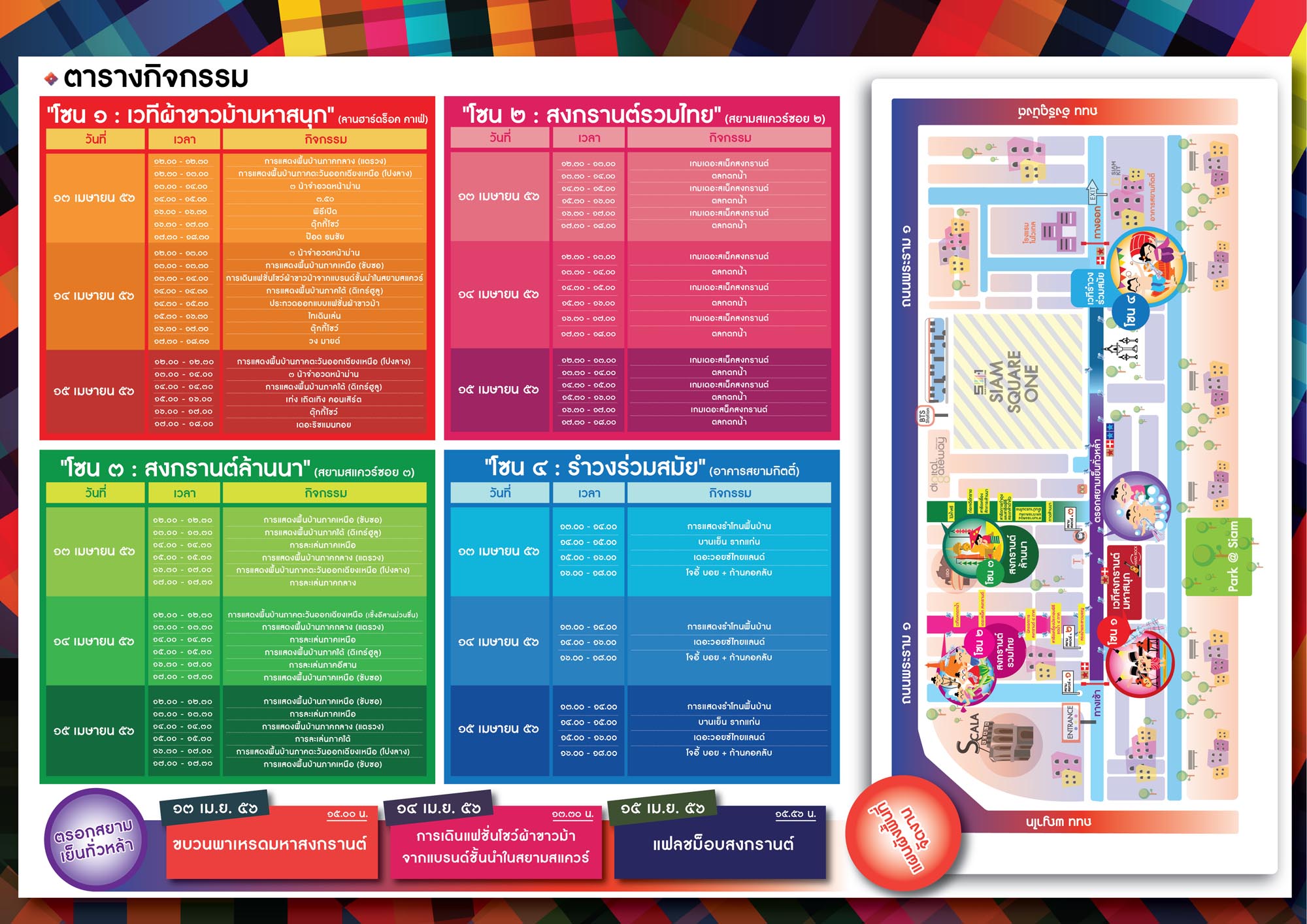 ตารางกิจกรรม เทศกาล ‘สงกรานต์เมษาผ้าขาวม้ารวมใจ ม่วนสงกรานต์ล้านนา’ วันที่ 13-15 เม.ย. 56 เวลา12.00-18.00 น. ณ ใจกลางสยามสแควร์