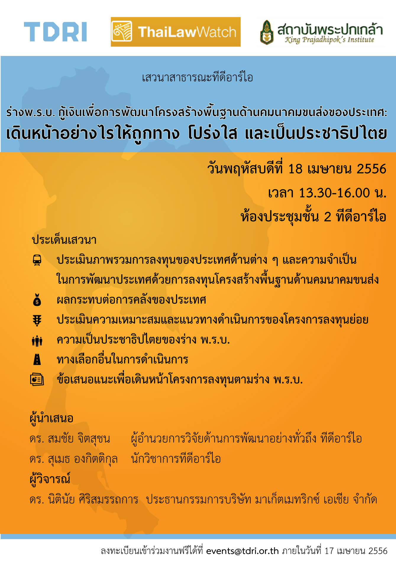 เสวนาสาธารณะทีดีอาร์ไอ ร่าง พ.ร.บ.กู้เงินเพื่อการพัฒนาโครงสร้าง พื้นฐานด้านคมนาคมขนส่งของประเทศฯ