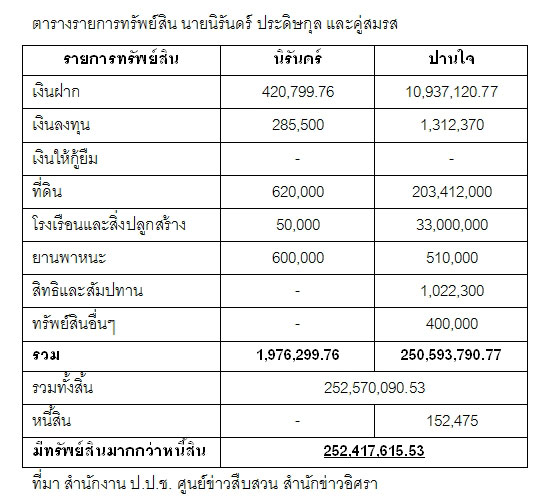 รายการทรัพย์สินของนายนิรันดร์ประกอบด้วย เงินฝาก420,799.76 บาท เงินลงทุน 285,500 บาท ที่ดิน 1 แปลง มูลค่า 620,000 บาท โรงเรือนและสิ่งปลูกสร้าง 50,000 บาท ยานพาหนะ รถยนต์ 2 คัน มูลค่า 600,000 บาท ไม่มีหนี้สิน