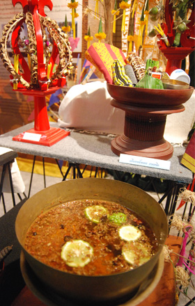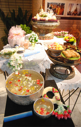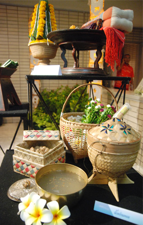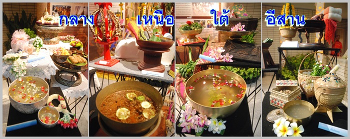 ขณะเดียวกันด้านหน้าหอประชุมก็มีการจัดนิทรรศการ “เครื่องรดน้ำดำหัว 4 ภาค” เป็นความรู้ให้แก่ผู้มาร่วมงาน ซึ่งแต่ละภูมิภาคก็มีการจัดเครื่องรดน้ำดำหัวแตกต่างกันเหมือนกัน มองผาด ๆ จากนิทรรศการที่จัดไว้จะเห็นเครื่องรดน้ำดำหัวของภาคเหนือมีเครื่องเคราดูมากกว่าภาคอื่น ๆ ส่วนสิ่งที่มีเหมือนกันสำหรับทุกภาคก็คือ พวกหมากพลู ผ้านุ่ง