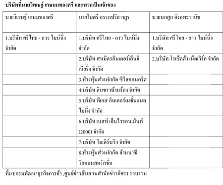 สำนักข่าวอิศรา www.isranews.org ตรวจสอบพบว่า บริษัท ศรีไทย - ลาว ไมน์นิ่ง จำกัด จดทะเบียนวันที่ 2 กรกฎาคม 2552 ทุน 1 ล้านบาท ประกอบกิจการด้านวิศวกรรมเหมืองแร่ เหมืองหิน โรงแต่งแร่ โรงหิน ที่ตั้งเลขที่ 364 หมู่ที่ 5 ตำบลยางเนิ้ง อำเภอสารภี จังหวัดเชียงใหม่ ณ วันที่ 4 เมษายน 2555 มีผู้ถือหุ้น 4 คน ได้แก่ นายวิเชษฐ์ เกษมทองศรี 8,000 หุ้น (80%) นายไมตรี อรรถปรียางกูร 1,000 หุ้น (10%) นางณัฎฐ์สิดา อรรถปรียางกูร นายนภศูล อังคทะวานิช คนละ 500 หุ้น นายวิเชษฐ์ เกษมทองศรี นายนภศูล อังคทะวานิช และ นายไมตรี อรรถปรียางกูร เป็นกรรมการ
