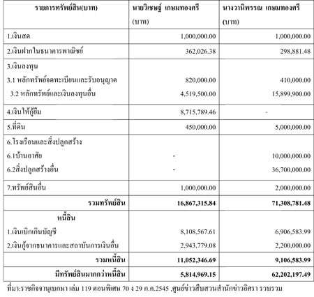 นางวานิพรรณ เกษมทองศรี คู่สมรส มีทรัพย์สินทั้งหมด 71,308,781.48 บาท ประกอบด้วย เงินสด 1,000,000 บาท เงินฝากในธนาคารพาณิชย์ 298,881.48 บาท เงินลงทุนหลักทรัพย์จดทะเบียนและรับอนุญาต 410,000 บาท หลักทรัพย์และเงินลงทุนอื่น 15,899,900 บาท ที่ดิน 5,000,000 บาท โรงเรือนและสิ่งปลูกสร้าง ประกอบด้วย บ้านพักอาศัย 10,000,000 บาท สิ่งปลูกสร้างอื่น36,700,000 บาท ทรัพย์สินอื่น 2,000,000 บาท มีหนี้สินทั้งหมด 9,106,583.99 บาท ประกอบด้วย เงินเบิกเกินบัญชี 6,906,583.99บาท เงินกู้จากธนาคารและสถาบันการเงินอื่น 2,200,000 บาท มีทรัพย์สินมากกว่าหนี้สิน 62,202,197.49 บาท