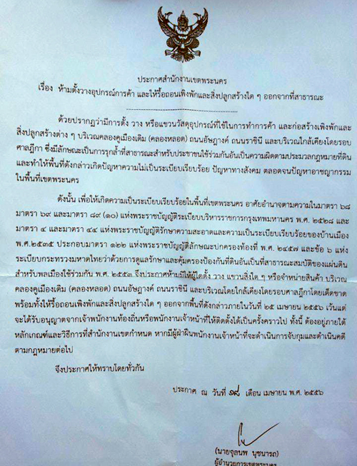 ผู้สื่อข่าวรายงานว่า บ่ายวันเดียวกัน เจ้าหน้าที่เทศกิจเขตพระนครประมาณ 80 นายร่วมกับเจ้าหน้าที่ตำรวจสถานีตำรวจนครบาลชนะสงคราม ลงพื้นที่แจกใบประกาศสำนักงานเขตพระนครแก่พ่อค้าแม่ค้าบริเวณคลองหลอด เรื่อง ‘ห้ามตั้งวางอุปกรณ์การค้า และให้รื้อถอนเพิงพักและสิ่งปลูกสร้างใด ๆ ออกจากที่สาธารณะ’ โดยมีใจความระบุว่า สืบเนื่องจากบริเวณคลองหลอด(คูเมืองเดิม) ถนนอัษฎางค์ ถนนราชินีและบริเวณใกล้เคียงโดยรอบศาลฎีกา มีการตั้งวางอุปกรณ์การค้าและสร้างเพิงพักซึ่งมีลักษณะรุกล้ำที่สาธารณะทำให้เกิดความไม่เป็นระเบียบเรียบร้อย จึงอาศัยอำนาจกฎหมายที่เกี่ยวข้องห้ามมิให้ผู้ใดตั้ง วาง สิ่งใด หรือ จำหน่ายสินค้า รอบบริเวณดังกล่าวโดยเด็ดขาด พร้อมทั้งให้รื้อถอนเพิงพักและสิ่งปลูกสร้างใด ๆ ออกจากพื้นที่ภายในวันที่ 25 เม.ย. 56 หากฝ่าฝืนจะจับกุมดำเนินคดีต่อไป