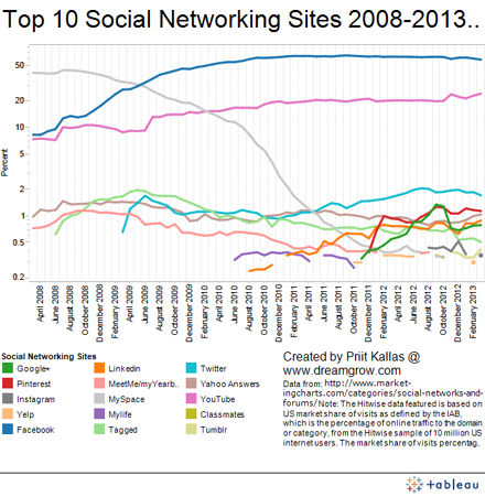 โดยส่วนแบ่งการตลาดของสื่อสังคมออนไลน์ 10 อันดับแรก ณ เดือนมีนาคม ปี 2556 มีดังนี้