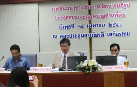 (24 เม.ย.) ที่คณะนิติศาสตร์ จุฬาลงกรณ์มหาวิทยาลัย สำนักงานปฏิรูป (สปร.) ร่วมกับคณะนิติศาสตร์ จุฬาฯ จัดสัมมนาทางวิชาการเพื่อการปฏิรูปโครงสร้างและกฎหมายด้านที่ดิน เพื่อนำเสนอแนวคิดในการร่างกฎหมายว่าด้วยภาษีที่ดินอัตราก้าวหน้า ร่างกฎหมายว่าด้วยธนาคารที่ดิน และร่างกฎหมายว่าด้วยสิทธิชุมชนในการจัดการที่ดินและทรัพยากร ซึ่งจะนำข้อเสนอนี้ต่อที่ประชุมสมัชชาปฏิรูประดับชาติ ครั้งที่ 3 ในเดือนมิถุนายนนี้