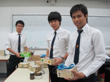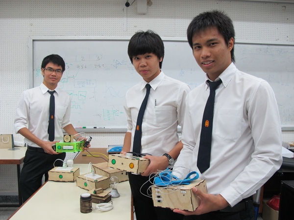 3 นักศึกษา “แบงค์” สพณ พิทักษ์ “สนุ้กเกอร์” สุพัทธ์ พยัพพฤกษ์ และ “แชมป์” ปฤษฎา เชื้อใจ นักศึกษาชั้นปีที่ 3 ภาควิชาวิศวกรรมระบบควบคุมและเครื่องมือวัด คณะวิศวกรรมศาสตร์ มจธ. เจ้าของผลงานที่ได้รับรางวัลรองชนะเลิศอันดับหนึ่งระดับประเทศ ในกลุ่มสิ่งประดิษฐ์ทางด้านการแพทย์สำหรับผู้ทุพพลภาพและด้อยโอกาส ในการประกวด “วันนักประดิษฐ์” ประจำปี 2556 จากสำนักงานคณะกรรมการวิจัยแห่งชาติ (วช.)