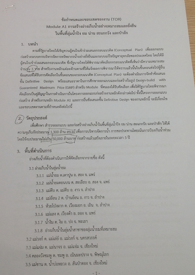 ประการที่สอง ตามข้อ 4.2 การออกแบบ กำหนดให้ผู้รับจ้างต้องดำเนินการสำรวจ ออกแบบ หรือทบทวนรายละเอียดตามผลการศึกษาที่ได้ทำการศึกษา เพื่อให้ได้รูปแบบโครงสร้างและรายละเอียดต่างๆ ตามวัตถุประสงค์ โดยอย่างน้อยต้องประกอบด้วยรายละเอียดของตัวเขื่อน อาคารระบายน้ำล้น อาคารท่อส่งน้ำ และอาคารประกอบอื่นๆ เพื่อใช้ส่งน้ำในการชลประทาน การอุปโภค การรองรับการผลิตไฟฟ้าพลังน้ำหากมีศักยภาพและมีความจำเป็นในภายหลัง