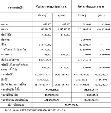 เปรียบเทียบกรณีวันที่ 25 ก.ย. 2551 และกรณี 6 ก.พ.2556 นายประดิษฐ์ และคู่สมรส มีทรัพย์สินลดลงทั้งสิ้น 20,053,630.24 บาท