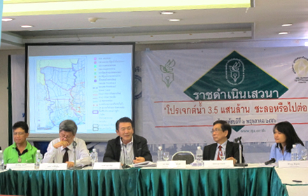 วันที่ 2 พฤษภาคม สมาคมนักข่าวนักหนังสือพิมพ์แห่งประเทศไทย ร่วมกับ สถาบันอิศรา มูลนิธิพัฒนาสื่อมวลชนแห่งประเทศไทย จัดราชดำเนินเสวนา "โปรเจกต์น้ำ 3.5 แสนล้าน ชะลอหรือไปต่อ" ณ ห้องประชุมอิศรา อมันตกุล ชั้น 3 อาคารสมาคมนักข่าวนักหนังสือพิมพ์แห่งประเทศไทย โดยมี นายต่อตระกูล ยมนาค อดีตนายก วิศวกรรมสถานแห่งประเทศไทย ในพระบรมราชูปถัมภ์ นายอุเทน ชาติภิญโญ อดีตที่ปรึกษานายกรัฐมนตรีด้านการระบายน้ำ นายประเชิญ คนเทศ ประธานกรรมการ ศูนย์ประสานงานเครือข่ายความร่วมมือฝ่าภัยพิบัติคนนครปฐม และดร.เสรี ศุภราทิตย์ ผอ.ศูนย์การเปลี่ยนแปลงภูมิอาการและภัยพิบัติ ม.รังสิต ร่วมเสวนา