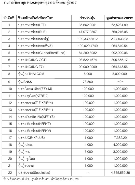 พล.อ.พฤณฑ์ และคู่สมรสมีเงินลงทุนรวมกัน 22 รายการ มูลค่า 32,909,523.66 บาท อาทิ บลจ.ทหารไทย(LTF) บลจ.ไทยพานิชย์(F7YIM) บลจ.ธนชาต(T-FIXFIFY1)หุ้นกู้ ปตท. เป็นต้น (ดูตาราง)