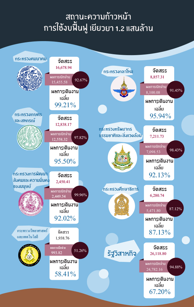 แผนภาพรายงานสถานะความก้าวหน้าการดำเนินโครงการ รายการค่าใช้จ่ายในการเยียวยา ฟื้นฟู และป้องกันความเสียหายจากอุทกภัยอย่างบูรณาการ ของ 8 หน่วยงานที่ได้รับงบจัดสรรหลัก