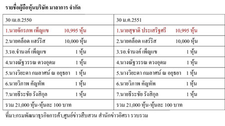 1.บริษัท มาลาการ จำกัด จำนวน 10,995 หุ้น มูลค่าหุ้นละ 100 บาท มูลค่า 1,099,500 บาท