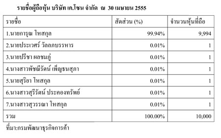 ข้อมูลจากกรมพัฒนาธุรกิจการค้าระบุว่า บริษัท เค.โซน จำกัด ประกอบธุรกิจสถานออกกำลังกาย จดทะเบียนวันที่ 24 มีนาคม 2549 ทุน 1 ล้านบาท ที่ตั้งเลขที่ 159/161 ถนนช่างอากาศอุทิศ แขวงสีกัน เขตดอนเมือง กรุงเทพฯ 30 เมษายน 2555 มีผู้ถือหุ้น 7 คน นายการุณ โหสกุล ถือหุ้นใหญ่ (ดูตาราง) นายการุณ โหสกุล และ น.ส. พัชณีรัตน์ เพ็ญธนสุภา (ชื่อเดิม น.ส.พัชณี เพ็ญวุฒิกุล) เป็นกรรมการ