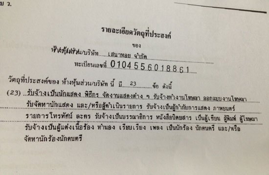 โดยในข้อ 23 ระบุว่า รับจ้างเป็นนักแสดง พิธีกร จัดงานแสดงต่างๆ รับจ้างทำโฆษณา ออกแบบงานโฆษณา รับจัดหานักแสดงและ /หรือ ผู้ดำเนินรายการ รับจ้างเป็นผู้กำกับการแสดง ภาพยนตร์ รายการโทรทัศน์ ละคร รับจ้างเป็นบรรณาธิการ หนังสือนิตยสาร เป็นผู้เขียน ผู้พิมพ์ ผู้โฆษณา รับจ้างเป็นผู้แต่งเนื้อร้องทำนอง เรียบเรียง เพลง เป็นนักร้อง นักดนตรี และ/หรือจัดหานักร้องนักดนตรี