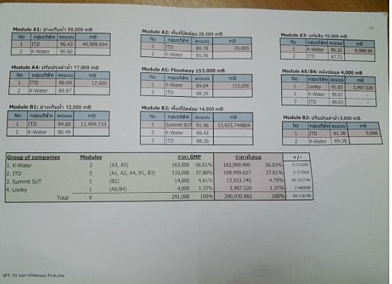 โมดูล เอ1 อ่างเก็บน้ำ ตามทีโออาร์กำหนดเพดานงบประมาณไว้ 50,000 ล้านบาท บริษัทที่ได้คะแนนสูงสุด คือ ITD หรือ Italian-Thai Development Public Company Limited (ITD) เสนอราคาไว้ 49,999 ล้านบาท