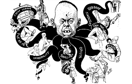 (ภาพการ์ตูนที่วาดขึ้นใน ค.ศ. 1886 แสดงให้เห็นถึงสิ่งเลวร้ายที่จะเกิดขึ้นหากชาวจีนได้รับการอนุญาตให้เข้ามาในประเทศออสเตรเลีย - ภาพจากวิกิพีเดีย)