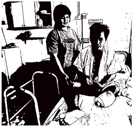 บรรยายภาพ : ชาวบ้านที่ต้องเสียขาจากกับระเบิดในสวนยางพารา เมื่อปลายเดือน ต.ค.ที่ผ่านมา นั่งอย่างหมดอาลัยตายอยากที่โรงพยาบาล (ภาพโดย นาซือเราะ เจะฮะ ภาพผ่านการตกแต่งโดยทีมข่าวอิศรา)