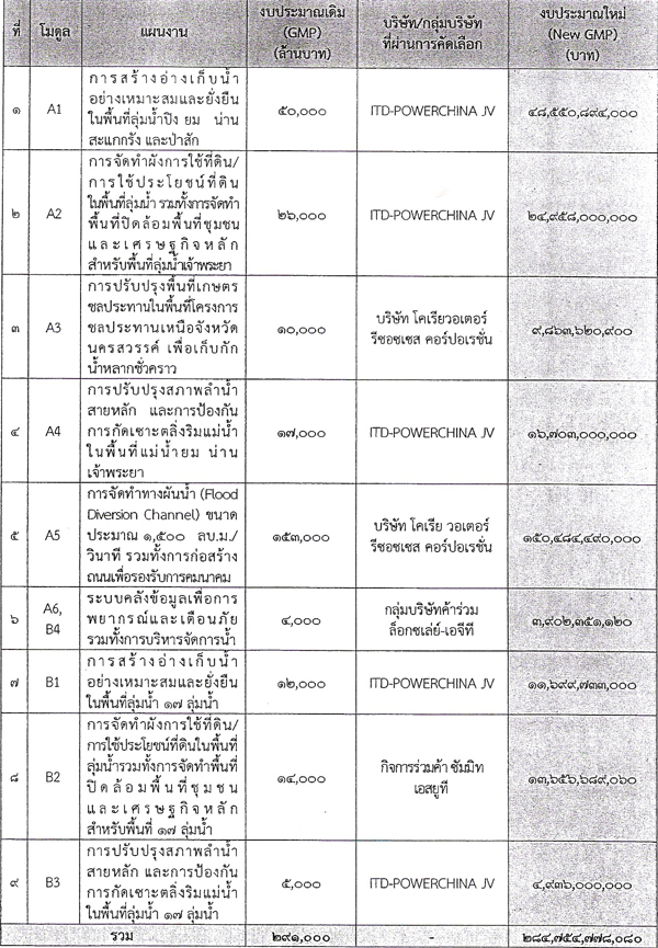 วันที่ 18 มิถุนายน นายปลอดประสพ สุรัสวัสดี รองนายกรัฐมนตรี ในฐานะประธานคณะกรรมการบริหารจัดการน้ำและอุทกภัย (กบอ.) เปิดเผยว่า ที่ประชุมคณะรัฐมนตรี (ครม.) เห็นชอบตามที่คณะกรรมการคัดเลือกคัดเลือกโครงการเพื่อออกแบบและก่อสร้างระบบการบริหารจัดการทรัพยากรน้ำอย่างยั่งยืนและระบบแก้ไขปัญหาอุทกภัยของประเทศไทย ที่มีศ.พิเศษธงทอง จันทรางศุ ปลัดสำนักนายกรัฐมนตรี เป็นประธานคณะกรรมการพิจารณา รวมถึงเห็นชอบตามที่ กบอ. และรัฐมนตรีเจ้ากระทรวงเสนอ ขออนุมัติกรอบวงเงินกู้ 304,000 ล้านบาท เพื่อเดินหน้าดำเนินโครงการต่อ