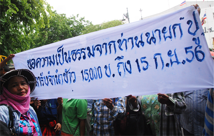 (25 มิ.ย.) ผู้สื่อข่าวรายงานว่า ที่ประตู 4 ทำเนียบรัฐบาล กลุ่มชาวนาจาก 22 จังหวัด ในนาม 3 สมาคมชาวนานำโดย นายภูติ ศรีสมุทรนาค นายกสมาคมส่งเสริมชาวนาไทย นายประสิทธิ์ บุญเฉย นายกสมาคมชาวนาข้าวไทย และนายวิเชียร พวงลำเจียก นายกสมาคมชาวนาและเกษตรกรไทย พร้อมด้วยตัวแทนชาวนาประมาณ 200 คน ได้เข้ายื่นจดหมายเปิดผนึกต่อนายกรัฐมนตรี เรียกร้องให้รัฐบาลทบทวนการปรับลดราคาการจำนำข้าว โดยขอให้คงราคารับจำนำข้าวที่ตันละ 15,000 บาท จนถึงวันที่ 30 ก.ย. นี้ กับขอให้กำหนดโควตารับจำนำไม่เกิน 500,000 บาทต่อครัวเรือน