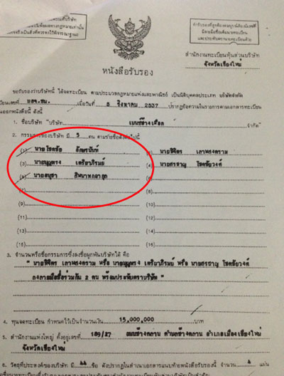 จากการตรวจสอบพบว่า ในช่วงเริ่มก่อตั้งบริษัทฯ นายบุญทรง เตริยาภิรมย์ เป็นผู้ยื่นแบบจองชื่อบริษัท เมื่อวันที่ 13 กรกฎาคม 2537 (ดูเอกสารประกอบ) และนายบุญทรง ยังปรากฏรายชื่อเป็นผู้มอบอำนาจแทนบริษัท เบนซ์ช้างเผือก จำกัด ให้นายประสิทธิ์ สัญญารักษณ์ เป็นผู้มายื่นขอจดทะเบียนจัดตั้งบริษัทแห่งนี้ เมื่อวันที่ 20 กรกฎาคม 2537