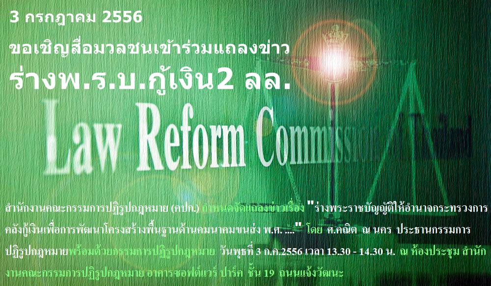 สำนักงานคณะกรรมการปฏิรูปกฎหมาย (คปก.) กำหนดจัดการ แถลงข่าวแก่สื่อมวลชน เรื่อง “ร่างพระราชบัญญัติให้อำนาจกระทรวงการคลังกู้เงินเพื่อการพัฒนาโครงสร้างพื้นฐานด้านคมนาคมขนส่ง พ.ศ. ....” โดย ศาสตราจารย์ ดร.คณิต ณ นคร ประธานกรรมการปฏิรูปกฎหมายพร้อมด้วยกรรมการปฏิรูปกฎหมาย ในวันพุธที่ ๓ กรกฎาคม ๒๕๕๖ เวลา ๑๓.๓๐ - ๑๔.๓๐ น. ณ ห้องประชุม สำนักงานคณะกรรมการปฏิรูปกฎหมายอาคารซอฟต์แวร์ ปาร์ค ชั้น ๑๙ ถนนแจ้งวัฒนะ อำเภอปากเกร็ด จังหวัดนนทบุรี