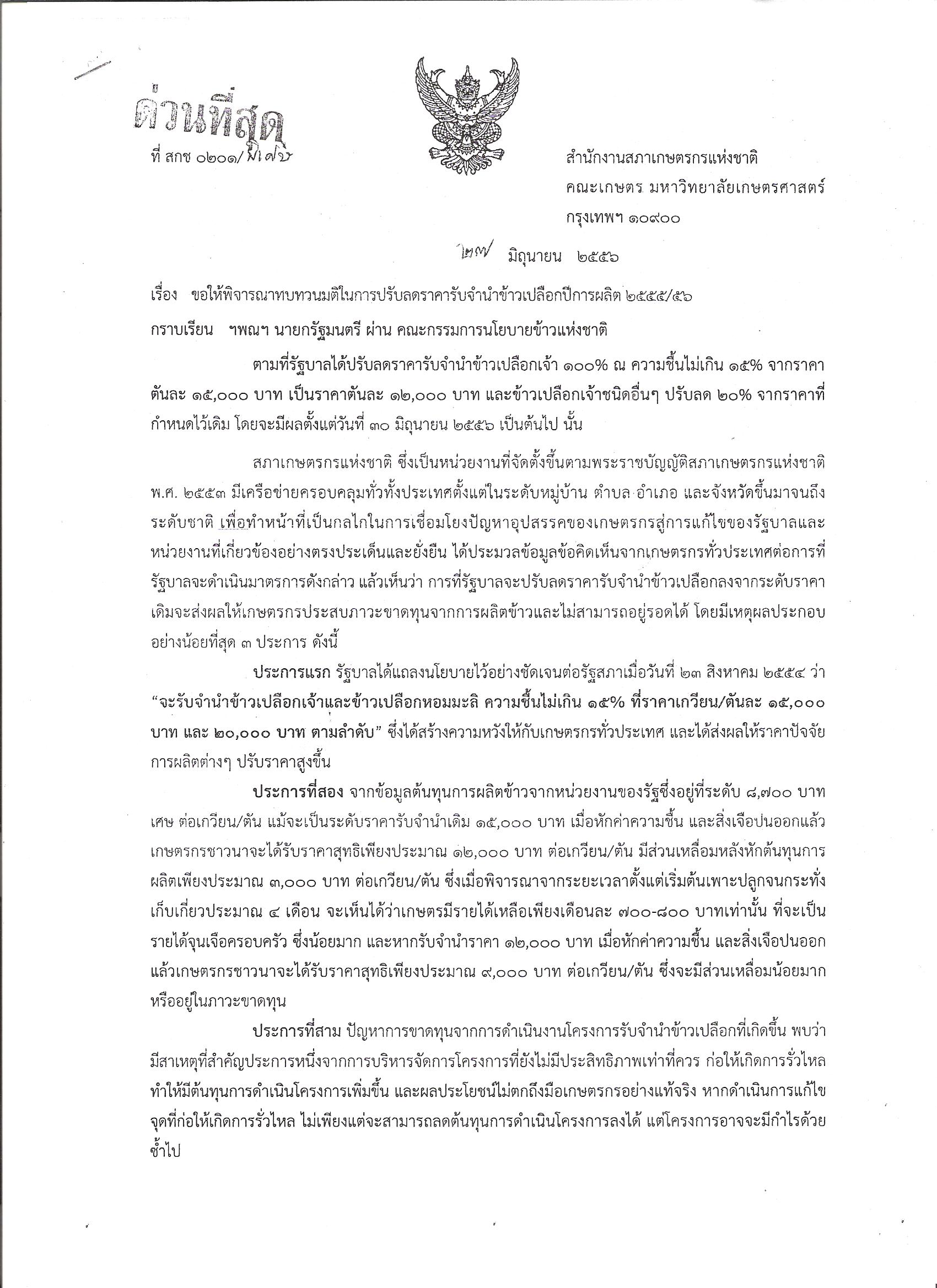 วันที่ 28 มิ.ย. 56 ที่ตึกนารีสโมสร ทำเนียบรัฐบาล นายอุบลศักดิ์ บัวหลวงงาม ประธานคณะกรรมการติดตามการดำเนินงานโครงการรับจำนำข้าวเปลือก ปี 2555/56 สภาเกษตรกรแห่งชาติ เข้ายื่นหนังสือต่อนายยุคล ลิ้มแหลมทอง รองนายกรัฐมนตรีและรัฐมนตรีว่าการกระทรวงเกษตรและสหกรณ์ (รมว.กษ.) ถึงน.ส.ยิ่งลักษณ์ ชินวัตร นายกรัฐมนตรี ในฐานะประธานคณะกรรมการนโยบายข้าวแห่งชาติ (กขช.) ขอให้พิจารณาทบทวนมติปรับลดราคารับจำนำข้าวเปลือกนาปีการผลิต 2555/56 ให้เป็นราคาตันละ 15,000 บาทตามเดิม