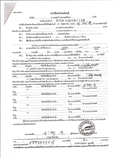 1.นายลี ฮัน กู 2.นายปาร์ค แจยอง 3.นายยูน บียอนฮุน 4.โกเรีย วอเตอร์ รีซอร์สเซส คอร์ปอเรชั่น ถือหุ้นร่วมกัน 4 คน 30,000 หุ้น เรียกชำระครั้งแรก หุ้นละ 25 บาท รวมเป็นเงินเรียกชำระค่าหุ้นครั้งแรก 750,000 บาท