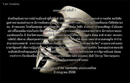 ผู้สื่อข่าวสำนักข่าวอิศรา www.isranews.org รายงานว่า เมื่อวันที่ 3 กรกฎาคม 2556 ในเพจ สมาพันธ์หน้ากากขาว V for vendetta แห่งประเทศไทย ซึ่งอ้างว่าเป็นเพจประสานงานทุกกลุ่มทุกสี ได้ออกแถลงการณ์ ฉบับที่ 1 โดยมีวัตถุประสงค์เพื่อยืนยันจะปักหลักชุมนุมเรียกร้องให้ น.ส.ยิ่งลักษณ์ ชินวัตร นายกรัฐมนตรีลาออกต่อไป โดยจะนัดชุมนุมกันทุกวันอาทิตย์ทั้งใน กทม. และต่างจังหวัดทั่วประเทศ โดยจะชุมนุมอย่างสงบจนกว่านายกรัฐมนตรีจะลาออก