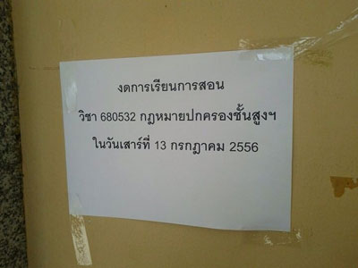 นิสิตคณะรัฐศาสตร์และนิติศาสตร์ รายหนึ่ง เปิดเผยสำนักข่าวอิศรา www.isranews.org ว่า ในช่วงเช้าวันนี้ อาจารย์รายนี้มีกำหนดที่จะต้องสอนหนังสือวิชา กฎหมายปกครองชั้นสูง แต่มีเจ้าหน้าที่คณะฯ นำป้ายงดการเรียนวิชานี้ มาติดไว้ที่หน้าห้องเรียน