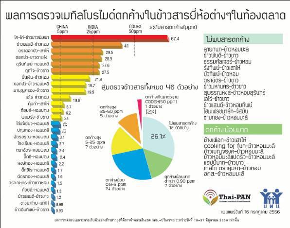 วันที่ 16 ก.ค. 56 ที่มูลนิธิเพื่อผู้บริโภค มูลนิธิเพื่อผู้บริโภค (มพบ.) ร่วมกับมูลนิธิชีววิถี และศูนย์ทดสอบฉลาดซื้อ แถลงรายงานผลการตรวจสอบสารเคมีตกค้างในข้าวสารถุง 46 ตัวอย่าง โดยน.ส.สารี อ๋องสมหวัง เลขาธิการมูลนิธิเพื่อผู้บริโภค กล่าวถึงการตรวจสารเคมีตกค้างในข้าวถุงครั้งนี้ เฉพาะจากยาฆ่าแมลงกลุ่มออร์กาโนฟอสเฟตและคาร์บาเนต, ยากันรา (fungicide) และสารรมควันข้าวเมทิลโบรไมด์เท่านั้น ส่วนสารพิษจากเชื้อราและคุณภาพข้าวถุงนั้นยังไม่เสร็จ
