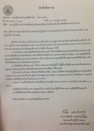 โดยระบุเนื้อหาว่า เพื่อให้การดำเนินการเป็นไปด้วยความเรียบร้อย คณะรัฐศาสตร์ฯ ขอเรียนแจ้งเกี่ยวกับแนวปฏิบัติการเก็บทรัพย์สินส่วนตัว และเคลื่อนย้ายสิ่งของอันเป็นทรัพย์สินของทางราชการในความครอบครองของบุคลากร กรณีบุคคลหลุดพ้นจากการปฏิบัติงานในคณะฯ มีข้อปฏิบัติทั้งหมด 6 ข้อ ดังนี้
