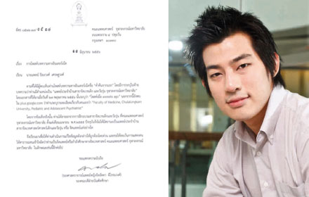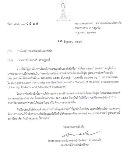 จึงเรียนมาเพื่อนให้ท่านดำเนินการแก้ไขข้อมูลดังกล่าวให้ถูกต้องโดยด่วน และขอให้ละเว้นการแสดงตนให้สาธารณชนเข้าใจผิดว่าท่านเป็นจิตแพทย์หรือกำลังศึกษาทางจิตเวชศาสตร์ คณะแพทยศาสตร์ จุฬาลงกรณ์มหาวิทยาลัย ในลักษณะเช่นนี้อีกต่อไป