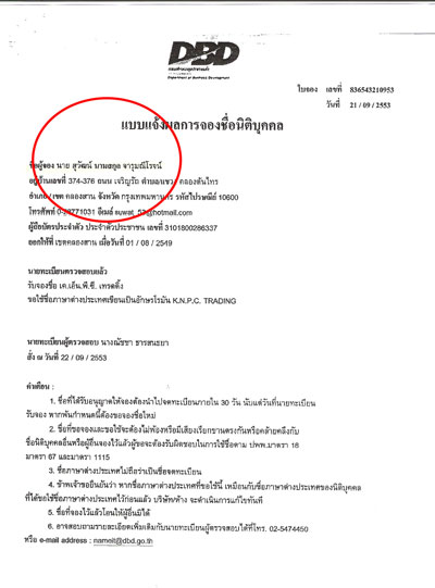 จากการตวรจสอบข้อมูลกับกรมพัฒนาธุรกิจการค้าพบว่า บริษัท เค.เอ็น.พี.ซี.เทรดดิ้ง จำกัด จดทะเบียนวันที่ 18 ต.ค.2553 ทุน 1 ล้านบาท ที่ตั้งเลขที่ 310/327 ถนนสรงประภา แขวงสีกัน เขตดอนเมือง กรุงเทพฯ หนังสือบริคณห์สนธิระบุ ผู้ถือหุ้น 3 คน