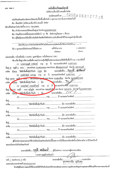 ในรายงานการประชุมจัดตั้ง บริษัท เค.เอ็น.พี.ซี.เทรดดิ้ง จำกัด ระบุว่ามีการประชุมเมื่อวันที่ 13 ตุลาคม 2553 เวลา 09.30 น.ณ บ้านเลขที่ 310/327 ถนนสรงประภา แขวงสีกัน เขตดอนเมือง กรุงเทพฯ ในข้อที่ 6 (จากทั้งหมด 7 ข้อ) ระบุว่า