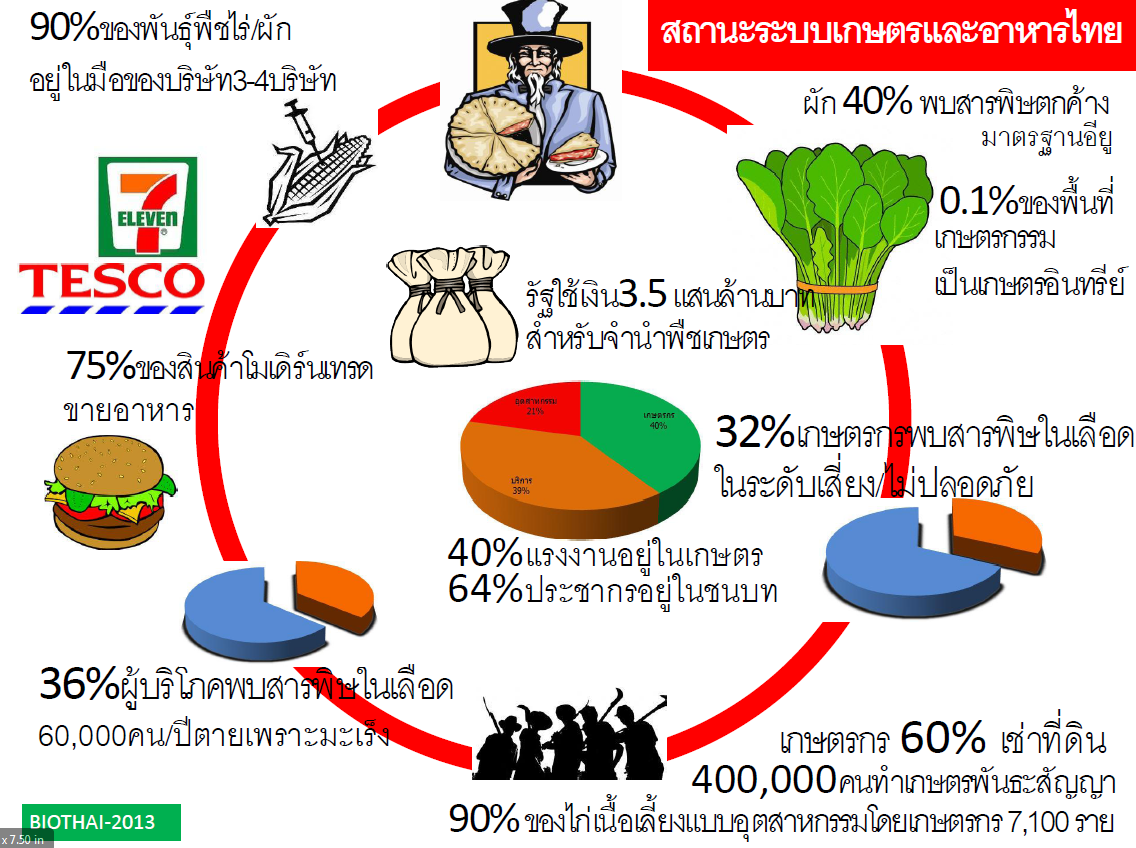 สำหรับสภาพความเป็นจริงกลับพบว่า กว่า 90% ของพันธุ์พืชไร่และผักที่ตกอยู่ในมือของบริษัทเพียง 3-4 บริษัท และ 75% ของสินค้าโมเดิร์นเทรดขายอาหาร แต่กลับส่งผลในการตรวจพบสารพิษในเลือดของผู้บริโภคถึง 36% หรือกว่า 60,000 คนต่อปี ที่มีอัตราการเสียชีวิตด้วยโรคมะเร็ง และอีก 32% ของเกษตรกรที่พบสารพิษในเลือดในระดับเสี่ยง และไม่ปกติ