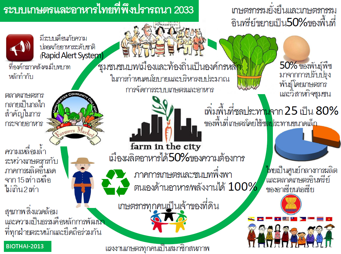 ขณะที่ 'ระบบเกษตรและอาหารไทยที่พึงปรารถนา' ในอีก 10 ปีข้างหน้า หรือในปี 2033 นั้น ข้อมูลของมูลนิธิชีววิถีระบุว่า ต้องการให้ชุมชนชนบท ชุมชนเมืองและท้องถิ่นเป็นองค์กรหลักในการกำหนดนโยบายและบริหารงบประมาณการจัดการระบบเกษตรและอาหาร เพิ่มพื้นที่ชลประทานจาก 25% เป็น 80% ของพื้นที่เกษตรโดยใช้ชลประทานขนาดเล็ก และทำให้เกษตรกรทุกคนเป็นเจ้าของที่ดิน