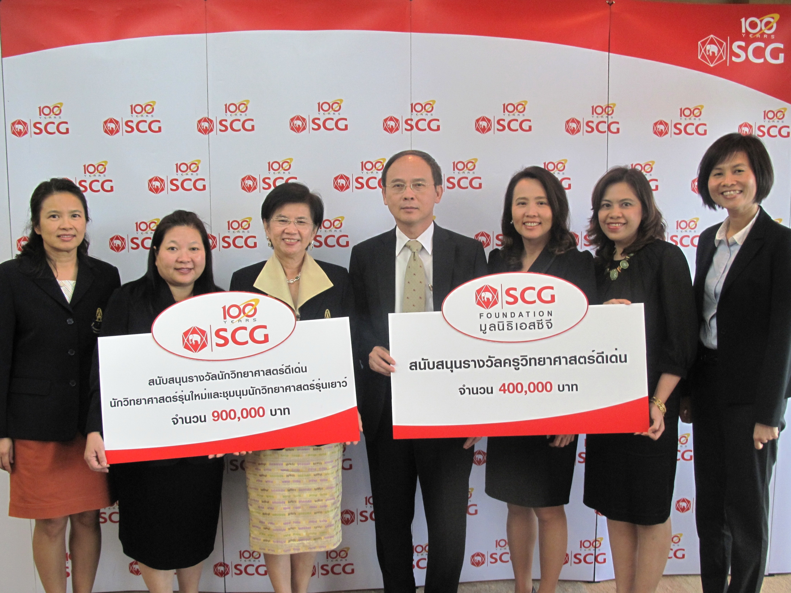 ธนวงษ์ อารีรัชชกุล (กลาง) ผู้ช่วยผู้จัดการใหญ่ – การบริหารกลาง เอสซีจี และสุวิมล จิวาลักษณ์ (ที่ 2 จากขวา) กรรมการและผู้จัดการมูลนิธิเอสซีจี พร้อมด้วยผู้บริหารเอสซีจี มอบเงินสนับสนุนรวม 1.3 ล้านบาท ให้แก่สมาคมวิทยาศาสตร์แห่งประเทศไทยฯ และมูลนิธิส่งเสริมวิทยาศาสตร์และเทคโนโลยี โดยมี รองศาสตราจารย์ ดร.ธารารัตน์ ศุภศิริ (ที่ 3 จากซ้าย) อุปนายกสมาคมวิทยาศาสตร์แห่งประเทศไทยฯ เป็นผู้รับมอบ สำหรับสนับสนุนรางวัลครูวิทยาศาสตร์ดีเด่น นักวิทยาศาสตร์ดีเด่น นักวิทยศาสตร์รุ่นใหม่ และชุมนุมนักวิทยาศาสตร์รุ่นเยาว์ ซึ่งจะจัดขึ้นในงานสัปดาห์วิทยาศาสตร์แห่งชาติ เดือนสิงหาคมนี้