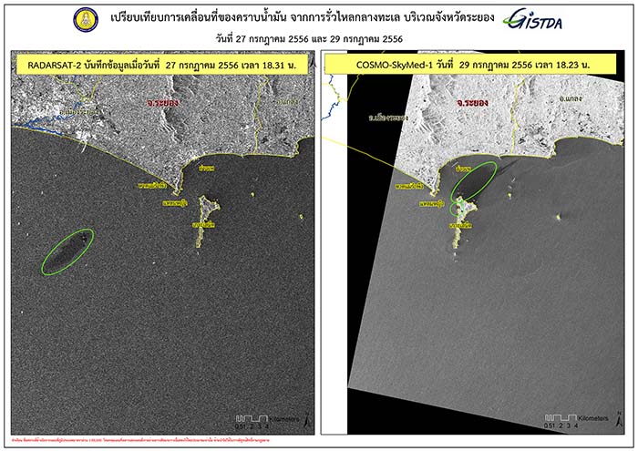 ซึ่งข้อมูลที่อ้างว่า “บางส่วนอาจเข้าไปถึงอ่าวศรีราชา” เป็นข้อมูลที่คลาดเคลื่อนจากความเป็นจริง ซึ่งในความเป็นจริงการแพร่กระจายของคราบน้ำมันอยู่ในขอบเขตจังหวัดระยอง โดยเฉพาะอ่าวแม่รำพึง – อำเภอแกลงเท่านั้น ทั้งนี้ GISTDA จึงขอแจ้งให้ทราบโดยทั่วกัน และสามารถติดตามข่าวได้ทางหน้าเว็บไซต์ www.gistda.or.th