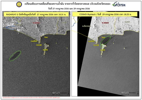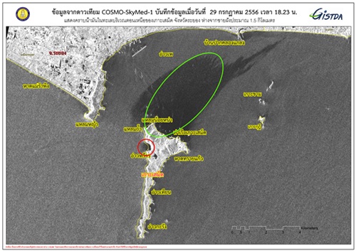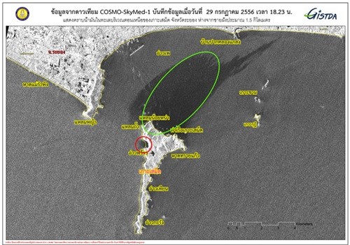 จากเหตุการณ์น้ำมันดิบรั่วประมาณ 50,000 ลิตร ในทะเล ห่างจากท่าเรือน้ำลึกมาบตาพุดไปทางทิศตะวันออกเฉียงใต้ประมาณ 20 กิโลเมตร เมื่อวันที่ 27 กรกฎาคม 2556 สำนักงานพัฒนาเทคโนโลยีอวกาศและภูมิสารสนเทศ (องค์การมหาชน) หรือ GISTDA กระทรวงวิทยาศาสตร์และเทคโนโลยี ได้ถ่ายภาพการเคลื่อนที่ของน้ำมัน ด้วยดาวเทียม COSMO-SkyMed-1 เมื่อเวลา 18.23 น. ของวันที่ 29 กรกฎาคม 2556 เพื่อติดตามสถานการณ์ดังกล่าว