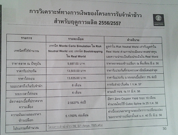 เมื่อเร็วๆ นี้ สถาบันการศึกษาชั้นนำด้านการบริหารธุรกิจ ซึ่งทำหน้าที่ชี้นำด้านวิชาการให้กับสังคม นำโดยศาสตราจารย์ ดร.อัญญา ขันธวิทย์ กีรตยาจารย์แห่งมหาวิทยาลัยธรรมศาสตร์ พร้อมคณะผู้วิจัย ร่วมกันศึกษาค้นคว้าเพื่อหาข้อเท็จจริง “วิศวกรรมการเงินว่าด้วยโครงการจำนำข้าวไทย” โดยมีการใช้ศาสตร์ทางวิศวกรรมทางการเงิน ทำแบบจำลอง หาความสัมพันธ์ทางคณิตศาสตร์ เพื่อมาวิเคราะห์จนทำให้เราได้เห็นข้อมูลเชิงประจักษ์ และเห็นชัดถึงตัวเลขขาดทุนจากโครงการนี้ลงลึกถึงระดับ...จุดทศนิยม