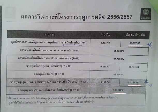 “เราคำนวณด้วยว่า หากในอนาคต เกิดเหตุการณ์ไม่พึงประสงค์ เช่น ข้าวราคาตกอย่างมาก ผลขาดทุนสูงสุดสามารถไหลไปได้ถึง -7,058.78 บาทต่อตัน หรือ -63.598%” ศ.ดร.อัญญา วิเคราะห์ตัวเลขที่ผ่านมาแล้ว