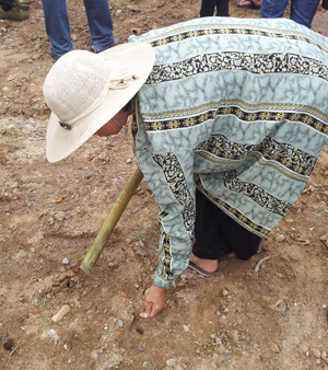 จากนั้นเริ่มต้นการ 'น่ำข้าว' หรือการทำนาแบบหยอดหลุม โดยใช้ไม้ทิ่มดินให้เป็นหลุม แล้วนำข้าวเปลือกหยอด จากนั้นใช้ไม้กดเกลี่ยปิดหลุมเป็นอันเสร็จสิ้น" นายมนัส จันทร์ผ่อง หมอยา และหมอทำขวัญ วัย 82 ปี ผู้เคยทำพิธีกรรมการปลูกข้าวเริ่มต้นเล่าย้อนถึงวิธีการปลูกข้าวไร่แบบภูมิปัญญาดั้งเดิม