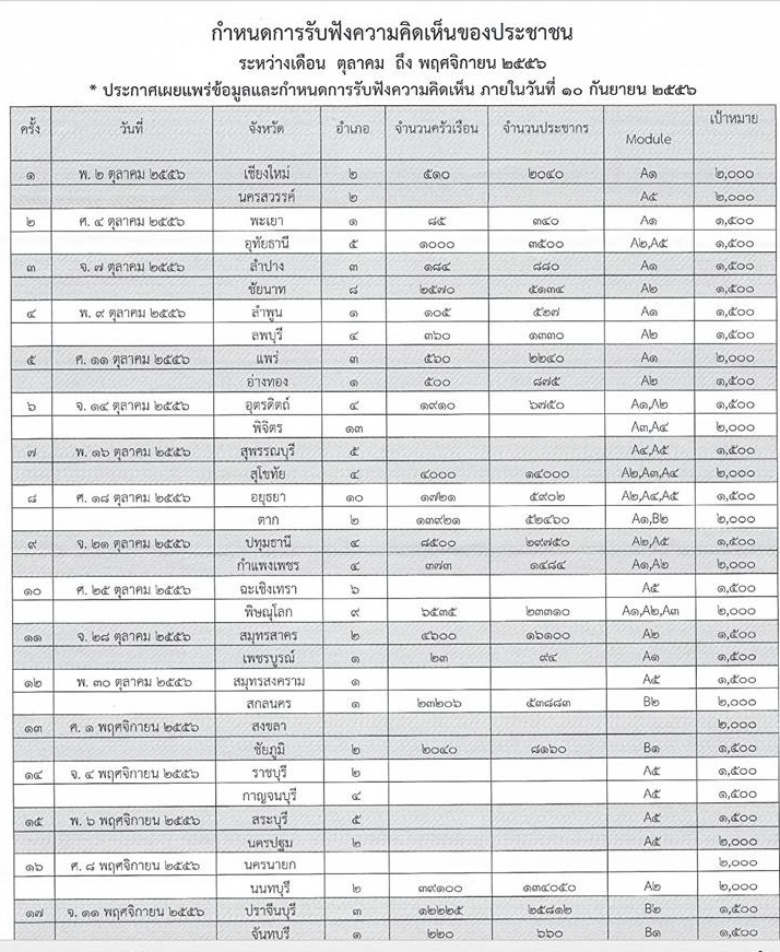 ตามที่รัฐบาล โดยคณะกรรมการบริหารจัดการน้ำและอุทกภัย (กบอ.) สำนักงานปลัดสำนักนายกรัฐมนตรีได้จัดทำแผนปฏิบัติการรับฟังความคิดเห็นของประชาชน ตามโครงการเพื่ออกแบบและก่อสร้างระบบการจัดการทรัพยากรน้ำอย่างยั่งยืนและระบบแก้ไขปัญหาอุทกภัย โดยมีเป้าหมายไปเปิดเวทีรับฟังความคิดเห็นของประชาชนรวม 36 จังหวัดที่อาจได้รับผลกระทบจากโครงการฯ ตั้งแต่เดือน 2 ต.ค.-19 พ.ย.56 นี้นั้น