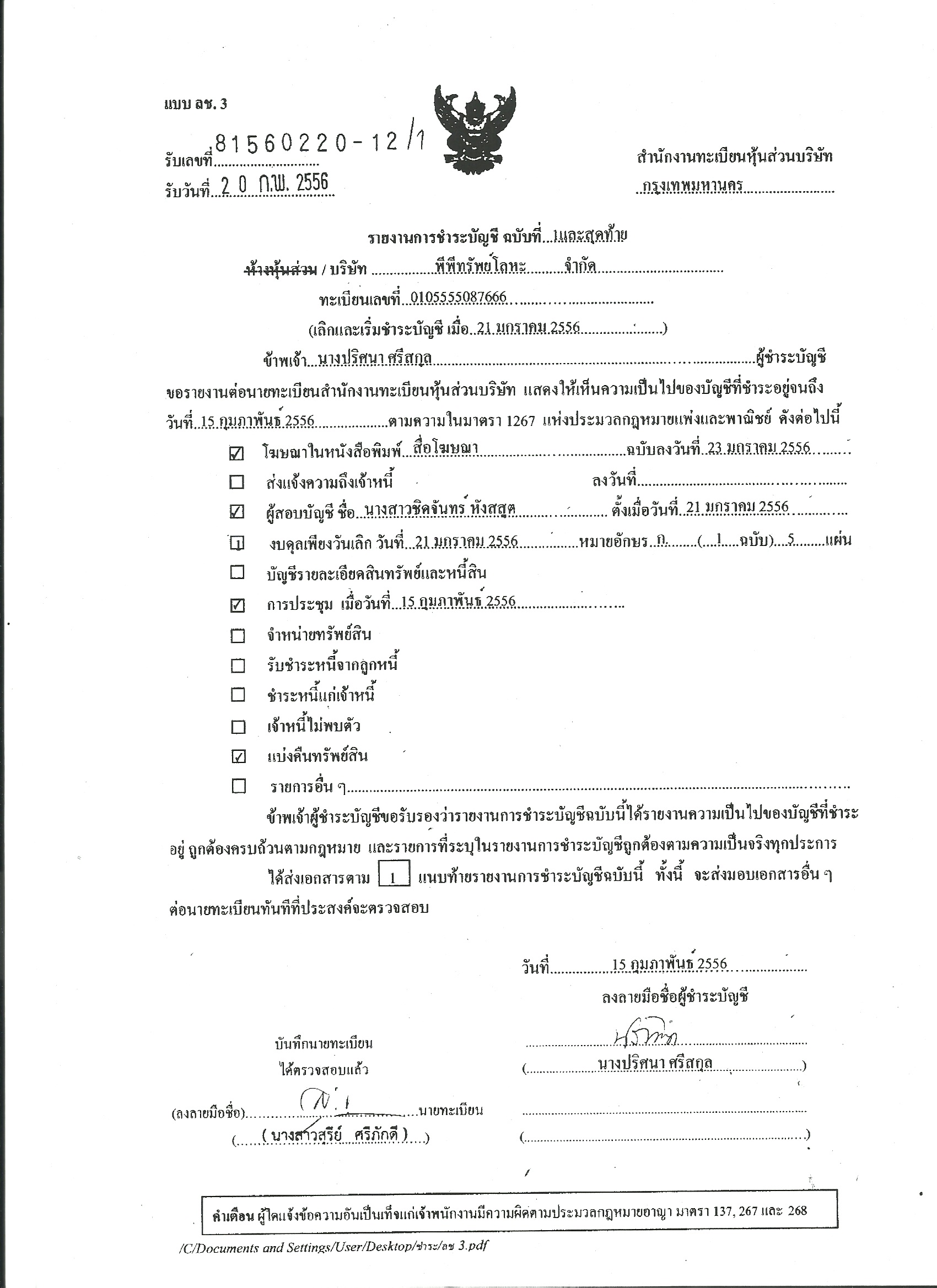 บริษัท พีพีทรัพย์โลหะ จำกัด ยื่นรายงานการชำระบัญชีฉบับที่ 1 และฉบับสุดท้าย เมื่อวันที่ 20 ก.พ.2556 ผู้ชำระบัญชีคือ นางปริศนา ศรีสกุล
