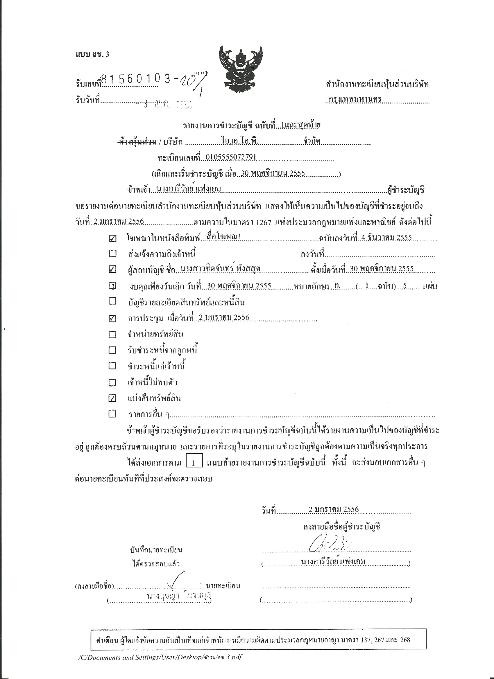 บริษัท โอ.เอ.โอ.พี จำกัด ยื่นรายงานการชำระบัญชีฉบับที่ 1 และฉบับสุดท้าย เมื่อวันที่ 3 ม.ค.2556 ผู้ชำระบัญชีคือนางอารีวัลย์ แฟงเอม