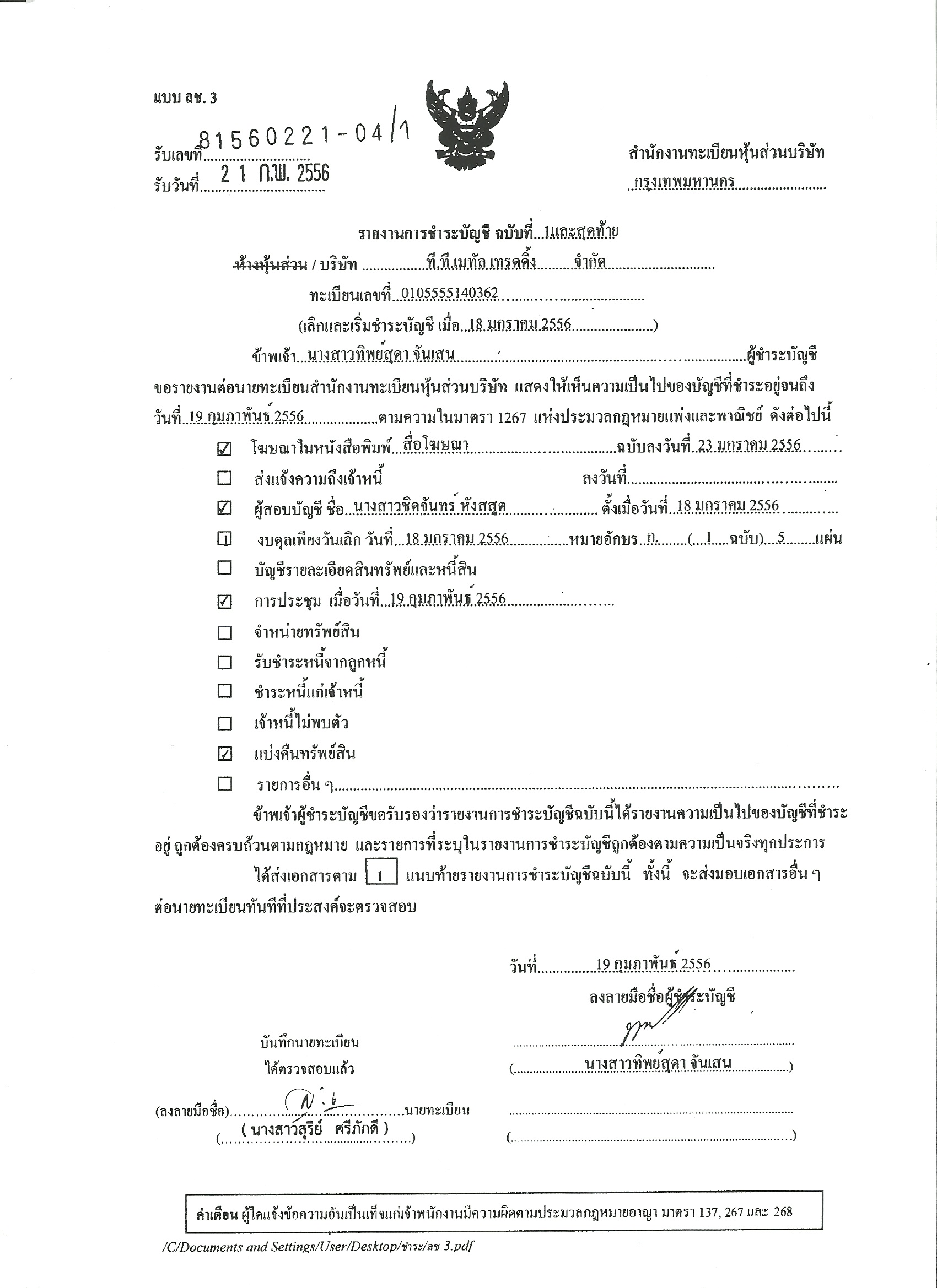 บริษัท ที.ที.เมทัล เทรดดิ้ง จำกัด ยื่นรายงานการชำระบัญชีฉบับที่ 1 และฉบับสุดท้าย เมื่อวันที่ 21 ก.พ.2556 ผู้ชำระบัญชีคือ นางสาวทิพย์สุดา จันเสน