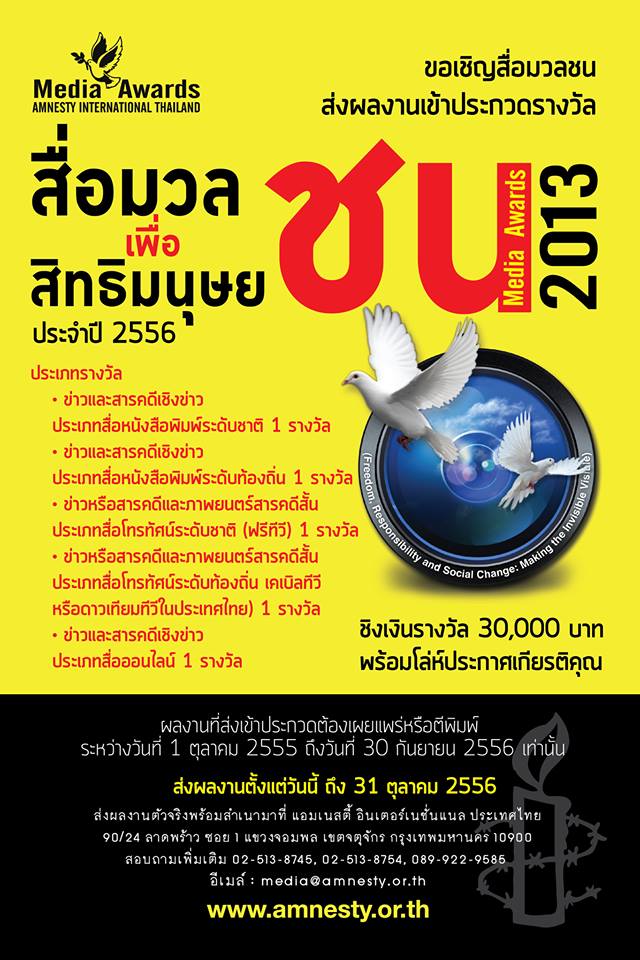 ขอเชิญสื่อมวลชนส่งผลงานเข้าประกวดรางวัลสื่อมวลชนเพื่อสิทธิมนุษยชน ประจำปี 2556
