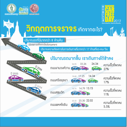 ขณะที่มีข้อมูลของสำนักการจราจรและขนส่ง(สจส.) จดสถิติพบว่า อัตราความเร็วเฉลี่ยในการเดินทางบนถนน ในช่วงชั่วโมงเร่งด่วน ปี 2554 - 2556 พบว่า นอกจากเกิดวิกฤตจราจรในพื้นที่กรุงเทพมหานครชั้นในมากขึ้นเรื่อยๆ แล้ว ยังขยายไปถึงพื้นที่ถนนในเขตกรุงเทพมหานครชั้นกลางอีกด้วย เช่น ถนนงามวงศ์วาน ลดลงร้อยละ 27 ถนนศรีอยุธยา ลดลงร้อยละ 17 ถนนสุขุมวิท ลดลงร้อยละ 11 ถนนพหลดยธิน ลดลงร้อยละ 5.5 และถนนรัชดาภิเษก ลดลงร้อยละ 4