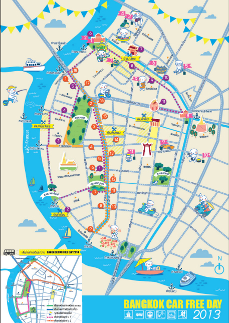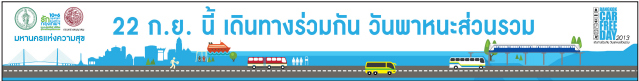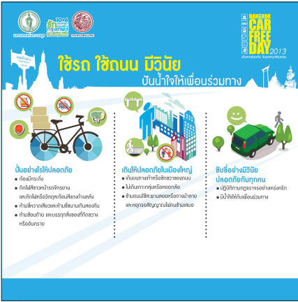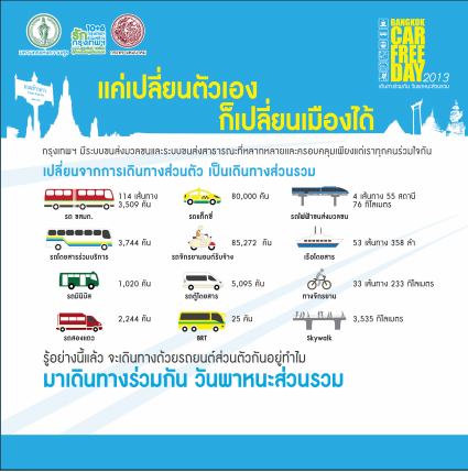 เช่นเดียวกับในปีนี้ ที่กรุงเทพมหานคร จัดโครงการ Bangkok Car Free Day 2013 ขึ้น ภายใต้แนวคิด "Share the Road" หรือ "เดินทางร่วมกัน วันพาหนะส่วนรวม" รณรงค์ให้เดินทางด้วยระบบขนส่งสาธารณะ ทั้ง รถไฟฟ้า รถไฟฟ้าใต้ดิน บีอาร์ที รถประจำทางและรถจักรยาน